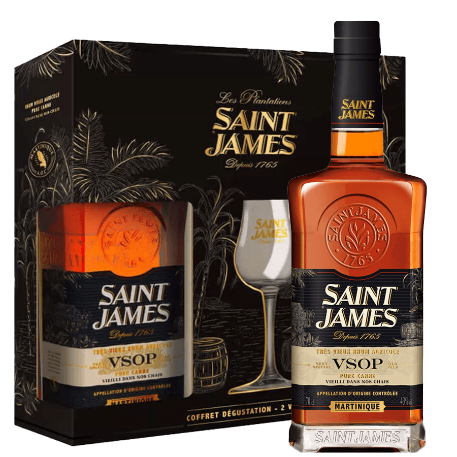 Descoperă Saint James VSOP 0.7L + 2 glasses, un pachet premium care include un rom VSOP rafinat și două pahare elegante pentru servire. Acest rom din Martinica, maturat atent, oferă arome complexe de vanilie, caramel, fructe uscate și lemn fin, fiind ideal pentru degustare simplă sau pentru cocktailuri sofisticate.